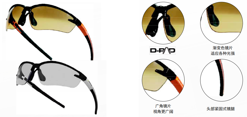 時尚款整片式漸變色防護眼鏡,高對比色酷絢外形,一體式變色鏡片,軟質(zhì)PVC鼻梁架,復合材料頭部緊固式鏡腿,符合人體工程學,消除普通鏡腿給耳朵的不適。黑色流線型前額鏡架,與時尚墨鏡設計理念同出一轍,讓你在防護自身的同時也不落后于時尚的潮流。