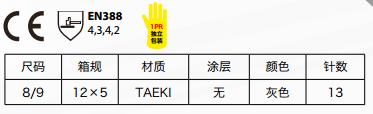 灰色防切割手套,無(wú)涂層,卓越的抗割性能且抓握牢固,尤其防止薄刀片割傷。TAEKI防割纖維比普通短纖維手套具有較高的耐磨損性能,可以水洗,有效重復(fù)使用延長(zhǎng)使用壽命。無(wú)皮絨皮毛污染。 適用于機(jī)械裝備,電子電器裝備及金屬薄板搬運(yùn)組裝等。