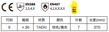 TAEKI系列高溫防切割手套,7針,長15厘米的抗熱牛皮袖口,全棉襯里,短時間可耐高溫250-300℃/15秒,防止機械傷害的全能保護手套,卓越的防切割性,抗撕裂性能。 適用于熱玻璃處理,高溫消毒,脫模熱塑等行業(yè)。