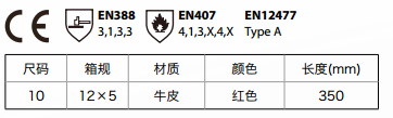 隔熱焊工防護(hù)手套,梔形拇指,牛皮加強(qiáng)掌面,加長袖口長14cm,可有效防護(hù)機(jī)械風(fēng)險(xiǎn),防火阻燃,抗傳導(dǎo)熱、接觸熱,性能100℃/15秒,同時(shí)可防止小滴熔化金屬濺射。 適用于電焊、氣割等焊接加工行業(yè)。