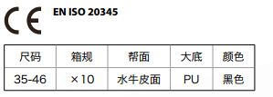 印度水牛皮鞋面,皮革厚度大于2.0毫米,新型高品質(zhì)雙密度PU注塑鞋底,SRC級(jí)防滑,輕便舒適。基本功能:防砸、耐磨、耐油,后跟吸能。
