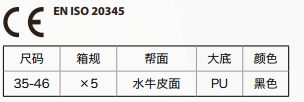 印度水牛皮鞋面,皮革厚度大于2.0毫米,特殊配方高品質(zhì)雙密度PU注塑鞋底,SRC級(jí)防滑。 基本功能:防砸、耐磨、耐油,后跟吸能。