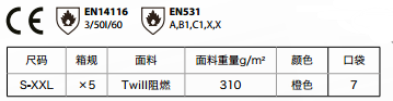 高端連體式Twill阻燃服,100%阻燃面料斜紋針織,3M熒光條環(huán)繞,隱蔽門襟,插肩袖,魔術(shù)貼 領(lǐng)口粘合設(shè)計。防護(hù)全面,有效抵抗熱傷害與化學(xué)傷害。全身多口袋設(shè)計,共7個口袋(含一個文具袋),方便使用,給工人帶來更多的便利。高彈力面料,柔軟舒適,橘色高可見度配色,不管白天還是晚上全天候作業(yè)都更安全放心。
